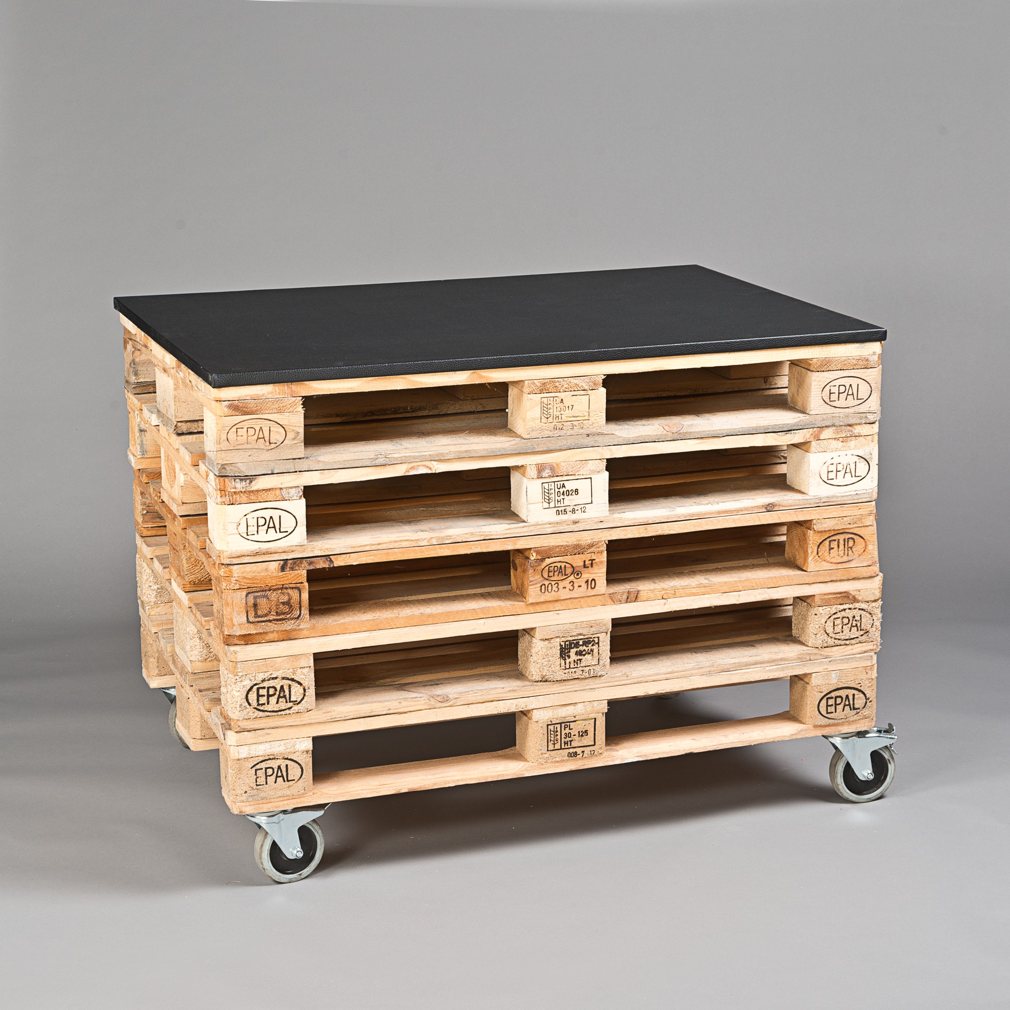Buffetelement, 5x Europaletten, Industrierollen, H 94 x L 120 x B 80 cm, Natur Zubehör inkl.: Auflage mit Kunstlederbezug, Schwarz