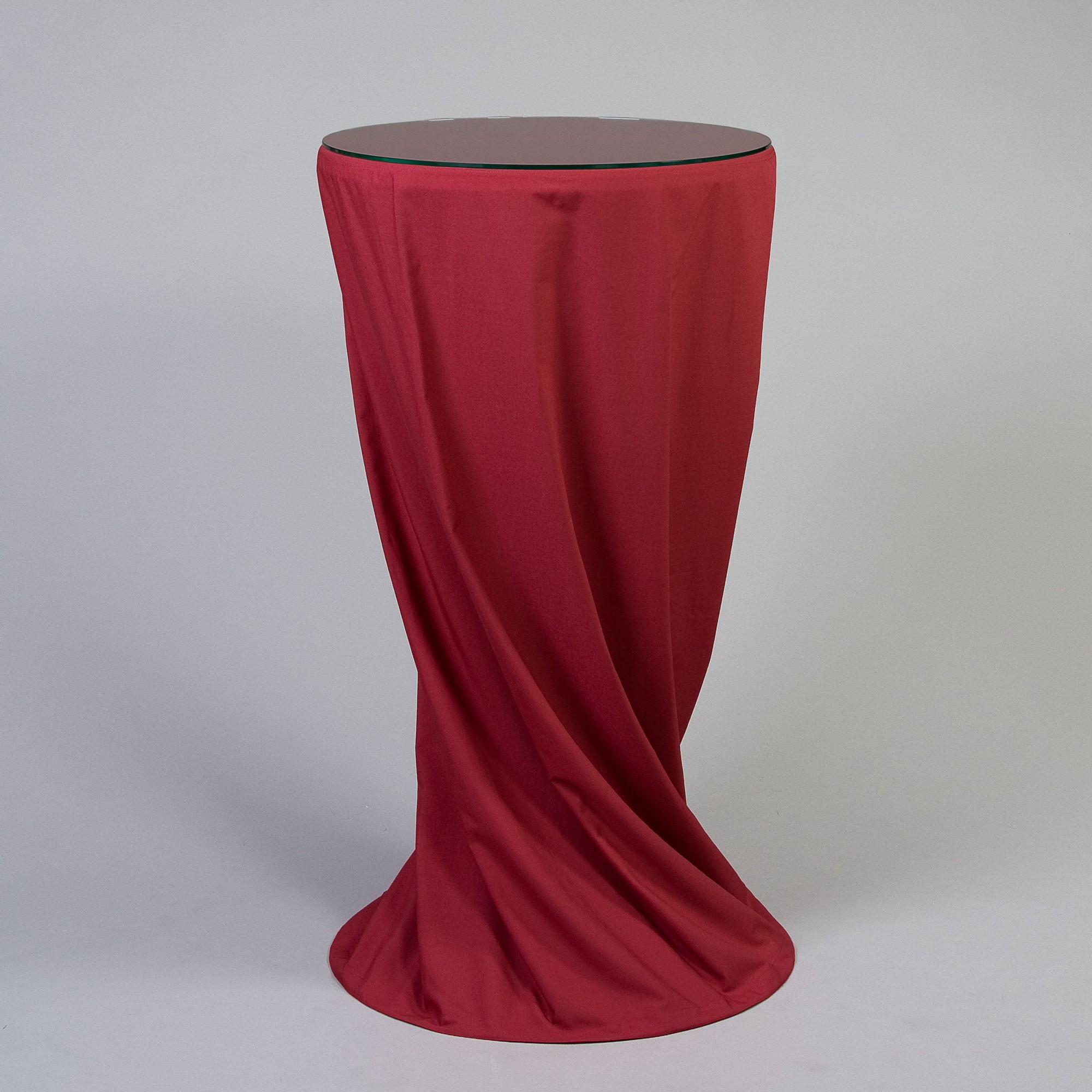 Husse Stehtisch D 60 cm, FTCS, bodenlang, Bordeaux mit eingesetztem Deckel D 60 cm permanent flammenhemmende Ausrüstung DIN 4102 B1 Zubehör optional: Molton, Ring D 50 cm, Weiss, Satinband zum Binden, Glasplatte