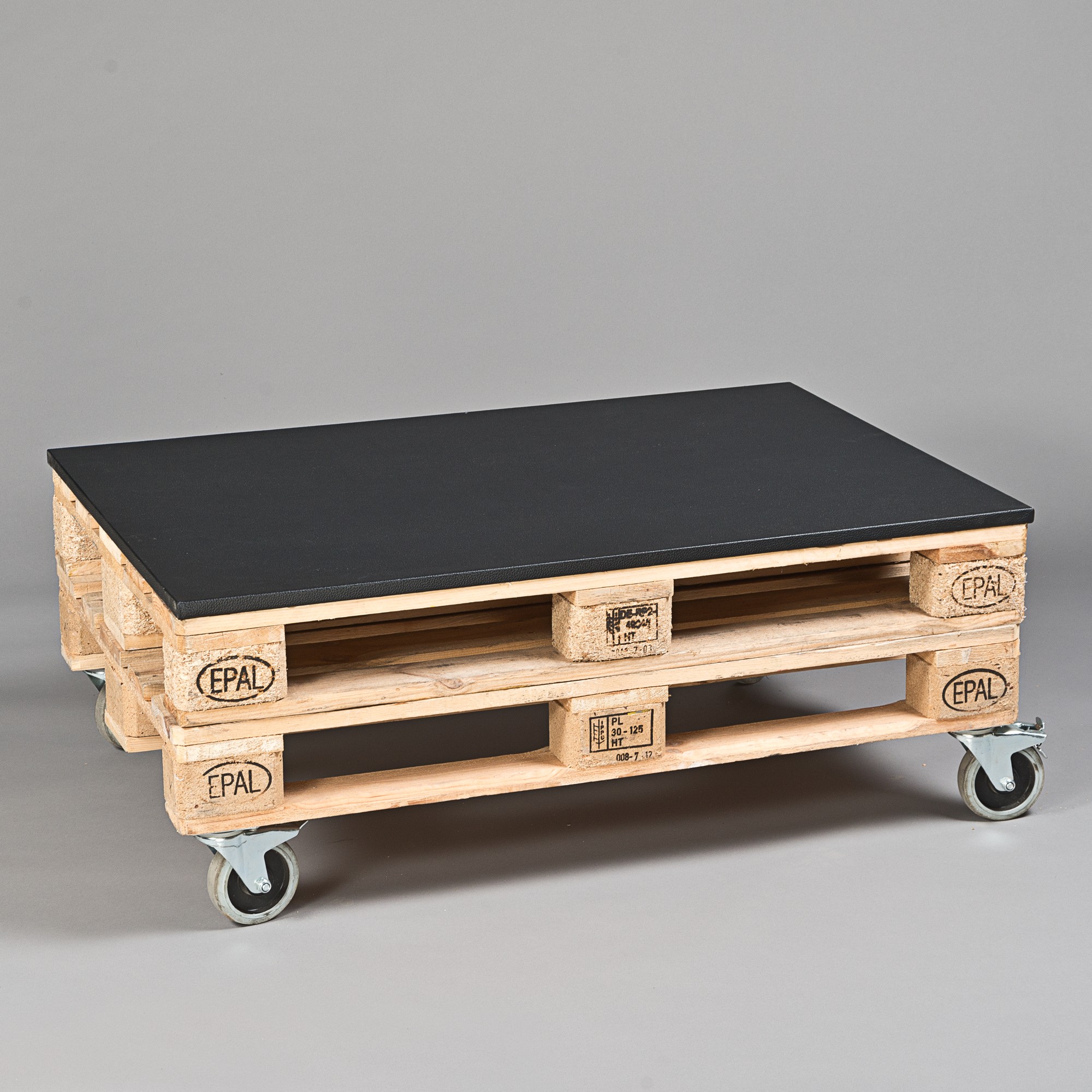 Loungetisch, 2 Europaletten, Industrierollen, H 60 x L 120 x B 80 cm, Natur Zubehör inkl.: Auflage mit Kunstlederbezug, Schwarz